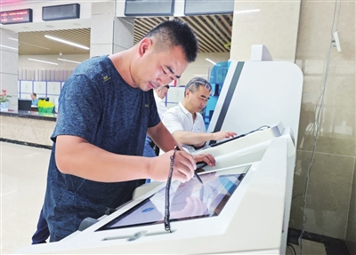 7月27日,在縣社保服務(wù)大廳,市民在IMT自助終端設(shè)備上辦理業(yè)務(wù)。今年,我縣完成“社保服務(wù)事項進(jìn)銀行”試運行和全面推廣工作,努力實現(xiàn)服務(wù)事項“就近辦、便捷辦、快速辦”目標(biāo)。