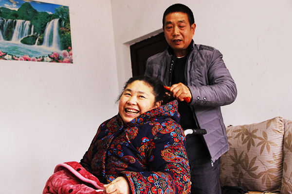 11月23日,小雪過(guò)后的鹿鳴鄉(xiāng)雙楓村日漸寒冷,但阮仕合的家里卻暖意融融。房間里,阮仕合輕聲地給妻子張家術(shù)說(shuō):“老張,我們梳頭了,輕輕梳哈?!比钍撕弦贿呎f(shuō)著,一邊熟練地梳起妻子長(zhǎng)長(zhǎng)的秀發(fā)。話音剛落,坐在輪椅上的妻子張家術(shù),發(fā)出如孩童般的笑聲應(yīng)和著丈夫阮仕合。