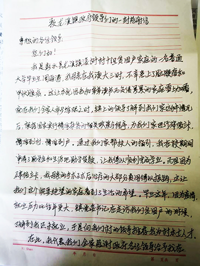 2月22日,周海濤和母親王世芬一起給龍溪鎮(zhèn)黨委政府送來了一封感謝信和一面繡有“真情為民 扶貧濟(jì)困”的錦旗,以此表達(dá)一家人對(duì)黨和政府的感激之情。