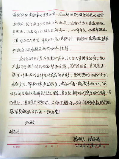 “通過幫扶責(zé)任人的指引,申請(qǐng)了助學(xué)金和生源地助學(xué)貸款,讓我得以順利完成學(xué)業(yè)。” 周海濤說。