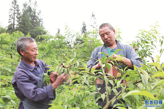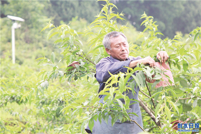 重慶彭水網(wǎng)(融媒體記者 陳興盛 黃智宇 張茂玉 文/圖) 日前,在長生鎮(zhèn)三合社區(qū)黃桃觀光園里,一個個果子已掛滿枝頭,桃林間,20多名村民正忙碌著,為黃桃疏果套袋。