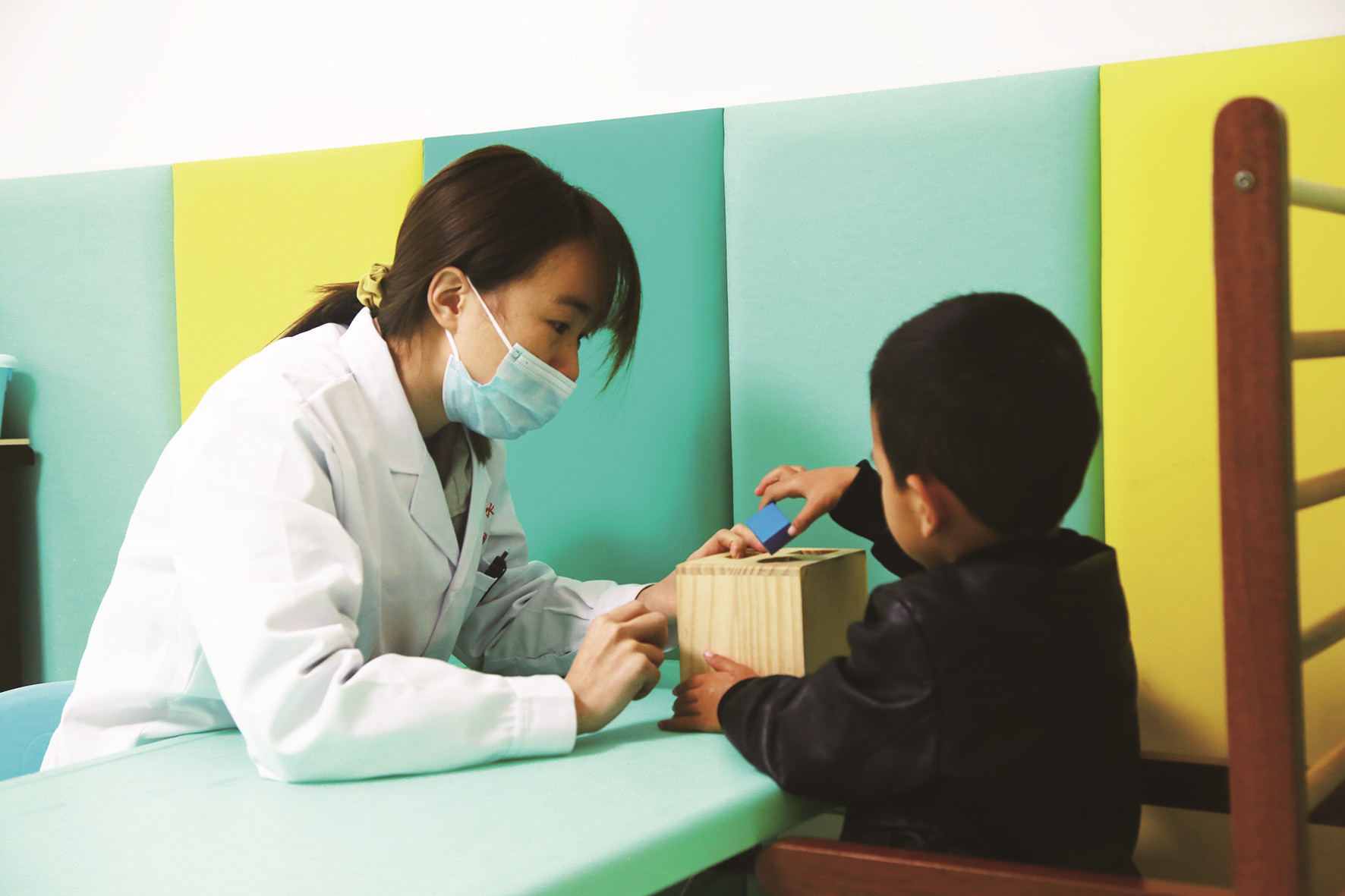 “這是三角形,我們要把它放在對(duì)應(yīng)的形狀里面去……”在靛水街道社區(qū)衛(wèi)生服務(wù)中心康復(fù)室內(nèi),康復(fù)治療師凌玉茹一邊對(duì)著身旁的小朋友說(shuō),一邊引導(dǎo)著小朋友。
