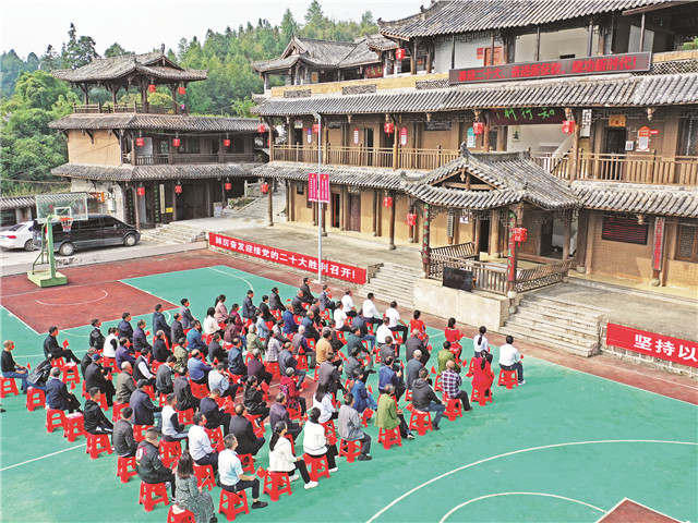 10月16日,諸佛鄉(xiāng)廟池村組織黨員干部群眾,在便民服務(wù)中心廣場上一起收看黨的二十大開幕會直播。 融媒體首席記者 趙 勇 攝影