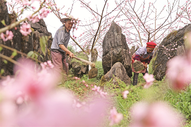 2022年2月14日,巖東鄉(xiāng)河壩村村民正在管護(hù)青脆李。2014年,巖東鄉(xiāng)在石漠化治理區(qū)域種植青脆李3000余畝,實(shí)現(xiàn)農(nóng)業(yè)轉(zhuǎn)型發(fā)展,帶動(dòng)當(dāng)?shù)卮迕駥?shí)現(xiàn)增收致富。