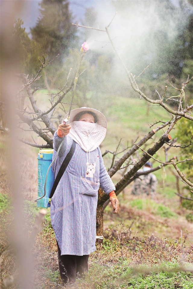 2020年3月22日,長生鎮(zhèn)三合社區(qū)村民正在為黃桃除草。2017年,三合社區(qū)種植1000畝黃桃,讓荒山變成花果山。