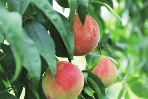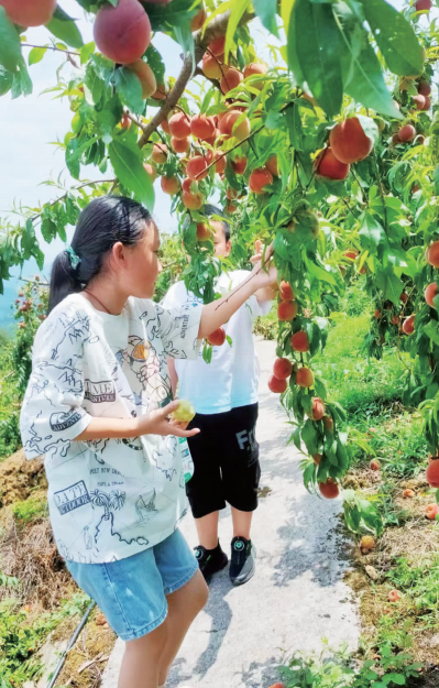 在烏江村蘋果桃種植專業(yè)合作社種植園內(nèi)果樹有序排列著,一個個粉紅的桃果掛在樹上,像蘋果似的,碩大飽滿,果香在園中氤氳開來,令人垂涎欲滴。游客穿梭在果園里,摘選、品嘗著蘋果桃,享受采摘的樂趣。