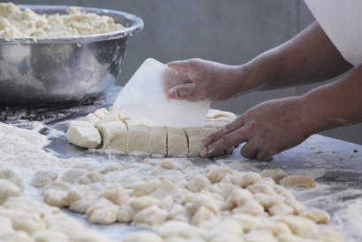 9月14日,在郁山鎮(zhèn)戴記食品工廠里,工人們正在搟酥、包餡、上芝、烘烤,制作傳統(tǒng)手工搟酥餅。