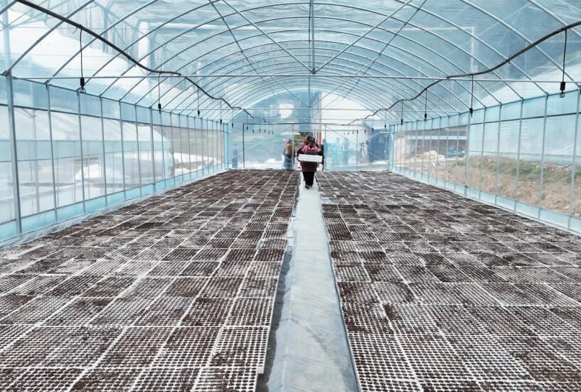 工人將穴盤轉(zhuǎn)移到大棚內(nèi)。 記者 甘勛樂 攝影