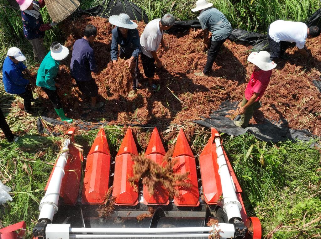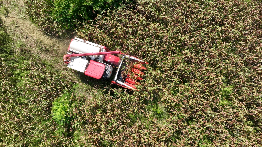 收割現(xiàn)場(chǎng),村民通過(guò)機(jī)器收割和人工收割相結(jié)合的方式搶收高粱,確保顆粒歸倉(cāng)。收割機(jī)來(lái)回穿梭忙著收割高粱,大口大口“吃進(jìn)”高粱穗,秸稈則被打碎后從收割機(jī)尾部排出還田;村民則拿著鐮刀收割機(jī)器去不到的地方。