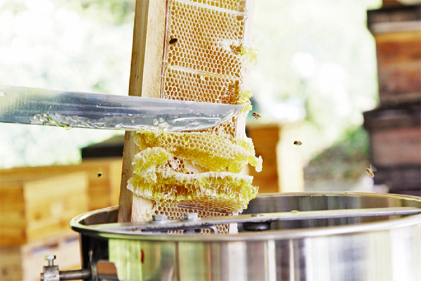 只見養(yǎng)蜂人戴著防護(hù)面罩,動作嫻熟地打開一個(gè)個(gè)蜂箱,蜂巢中滿是密密麻麻的蜜蜂,很多蜜蜂還圍繞蜂巢嗡嗡地飛舞著。養(yǎng)蜂人輕輕取出巢脾,上面掛滿了晶瑩剔透的蜂蜜,在陽光的照耀下,宛如一顆顆璀璨的黃金。隨著割蜜刀的輕輕劃過,香甜醇厚的蜂蜜緩緩流出,那濃郁的香氣瞬間彌漫在空氣中,讓人垂涎欲滴。