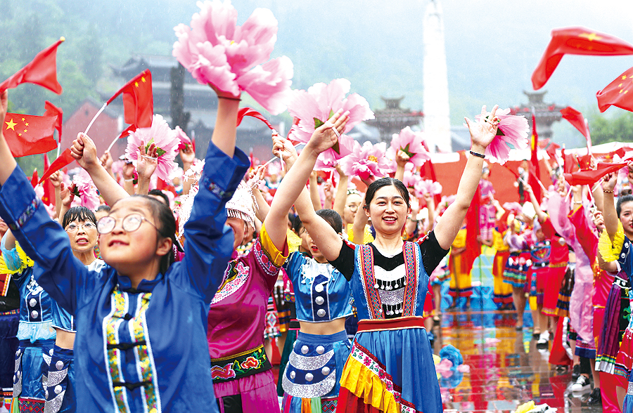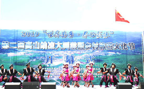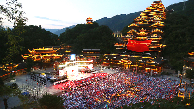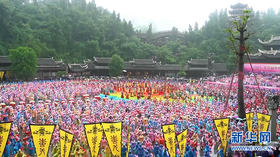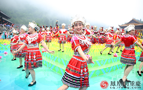 世界苗鄉(xiāng),養(yǎng)心彭水。5月12日,2019?第八屆中國烏江苗族踩花山節(jié)暨中國?彭水水上運(yùn)動(dòng)大賽隆重開幕,全縣上萬名穿著節(jié)日盛裝的苗鄉(xiāng)兒女,萬人同唱嬌阿依,萬人共舞踩花山,歌唱《我和我的祖國》。