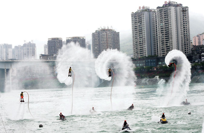 世界苗鄉(xiāng),養(yǎng)心彭水。5月12日,2019·第八屆中國烏江苗族踩花山節(jié)暨中國·彭水水上運動大賽(簡稱“一節(jié)一賽”)隆重開幕,來自國內(nèi)外的嘉賓、八方游客和全縣上萬名穿著節(jié)日盛裝的苗鄉(xiāng)兒女,萬人同唱嬌阿依,萬人共舞踩花山,多國滑水精英水上表演,水上摩托競速挑戰(zhàn)。